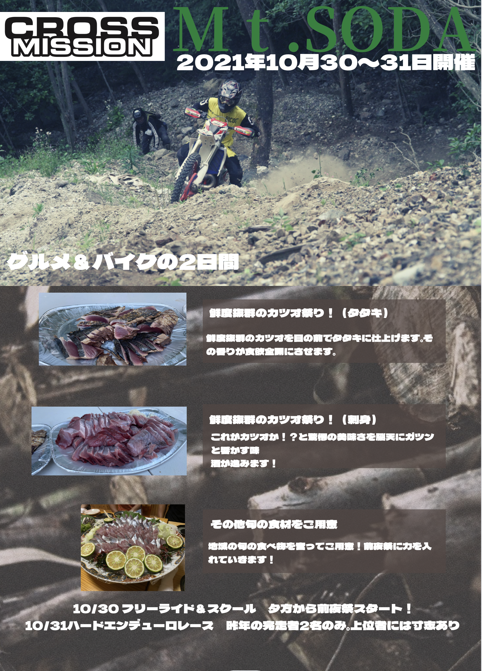 桑田山をよくする会の方達と悪巧みをして作成する超難関コースを使用してのハードエンデューロレース。基本的にNO HELPですがライダー同士の助け合いと観客・スタッフによる修理や水の受け渡し等は可能。前に進みのはライダーの独力で行なう。