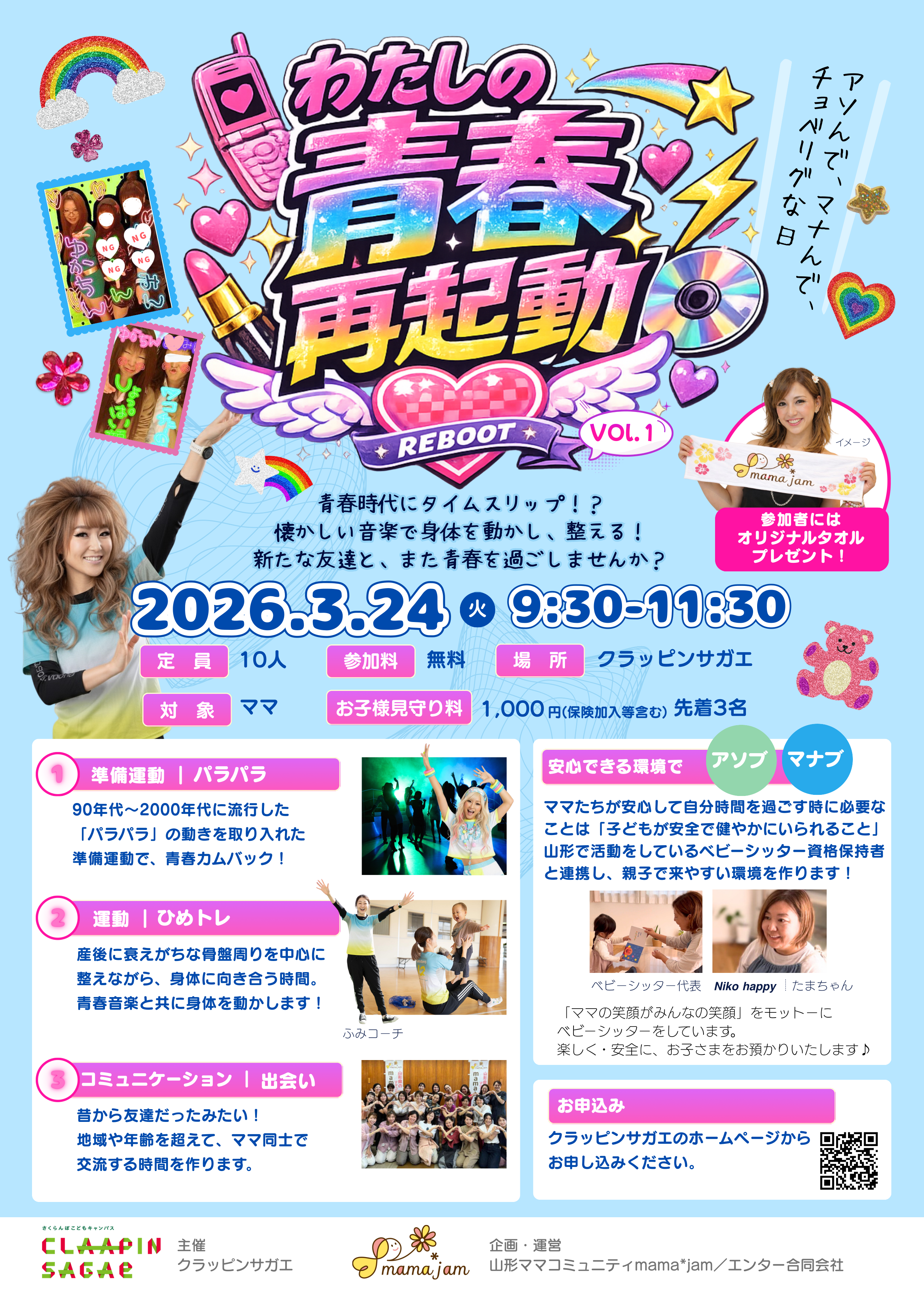 産後に衰えがちな骨盤周りを中心に整えながら、 身体に向き合う時間。青春音楽と共に身体を動かします!