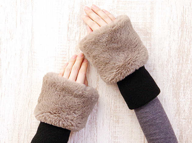 カフスはお手持ちのカットソーやセーターの袖口に差し入れたり、上に着けたり、袖巾の広いコートに合わせると隙間風も防げとても暖かに♪