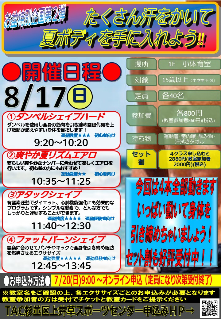 夏らしい爽やかなナンバーに合わせて楽しくエアロを行います。 初心者の方にもおすすめ!前日の妙正寺のレッスンとは内容が変わります。