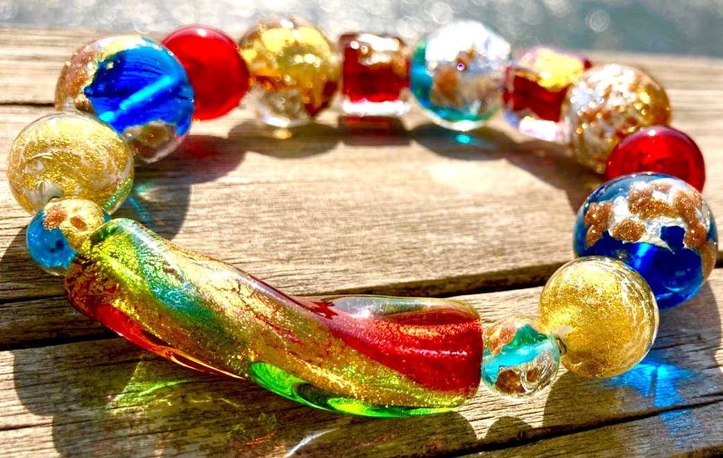 龍神ブレスとして、一個づつベネチアの職人に金箔銀箔入りの色鮮やかなベネチアンビーズを作製していただき、飽きが来ないように、購入者に一個づつ色を選んで頂き、最後に持つ方に良い事が起こる様に、お祈りしてお渡し致します。
