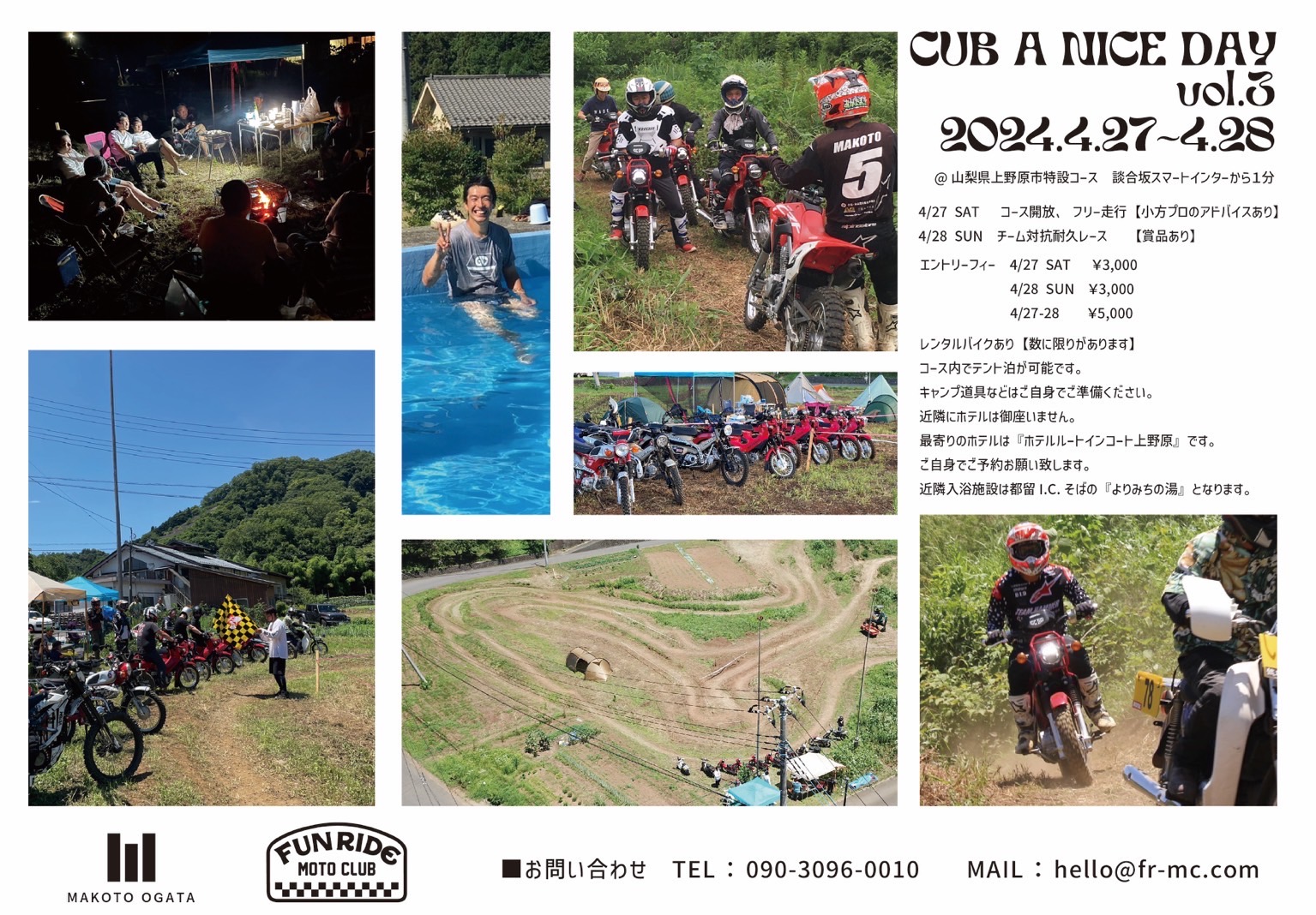 オフロードノーマルタイヤ、ノーマルタイヤ、いずれのビジネスバイクでも可能。(ブロックタイヤをお勧めいたします)小排気量125cc以下のカブ、モンキー、ベンリーをはじめ、HONDAなどのビジネスバイクでも参加可能。