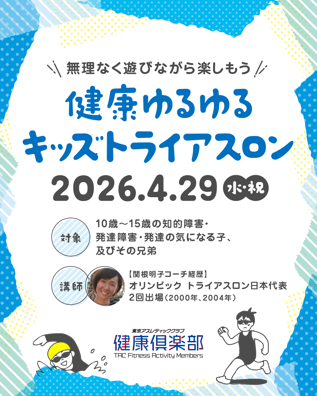 「東京アスレティッククラブ健康俱楽部 (トライアスロンジャパン、中野区トライアスロン協会、国分寺市トライアスロン協会、GOOPA発達の気になる子と楽しむイベントサークル協賛)」