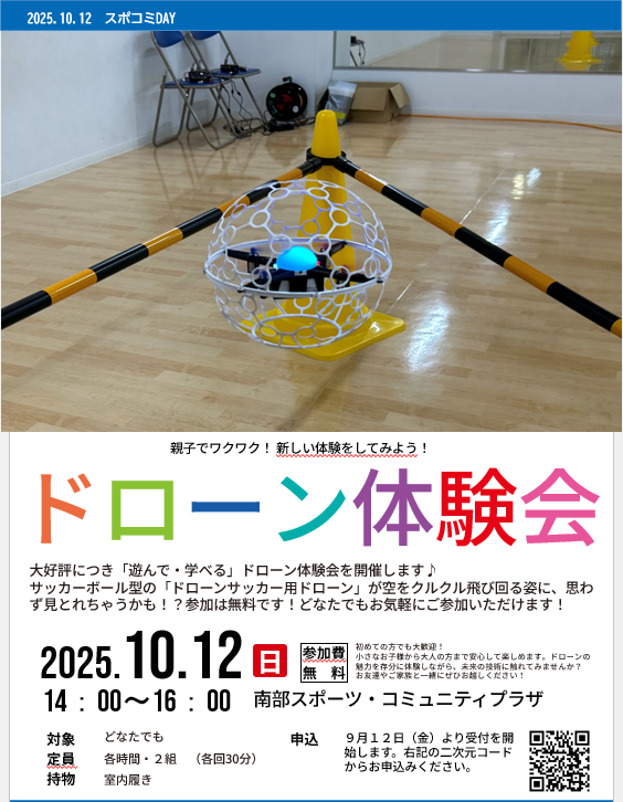 ドローンで遊んで、学んで、ワクワクしよう!どなたでもご参加いただける、無料のドローン体験会を開催します!今回使用するのは「ドローンサッカー用ドローン」。サッカーボールのように空中を自在に飛び回る姿に、きっと驚きと感動を感じるはずです!