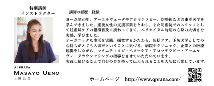 ヨーガ歴20年、アーユルヴェーダやアロマテラピー、均整術などの東洋医学を学んできました。産後女性の支援事業をとおし、また助産院でのスタッフとして妊産婦ケアの指導普及に携わってきて、ペリネイタル時期の心身の大切さを実感、学びました。