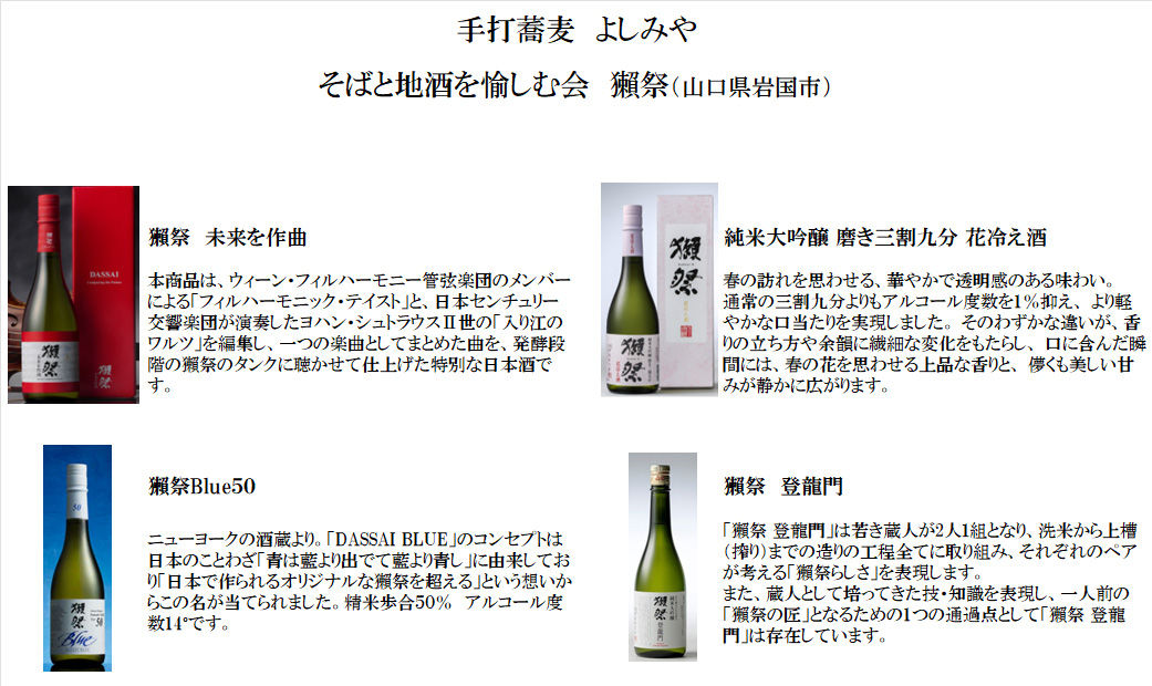 今回の蔵は山口県にある「獺祭」。獺祭酒造さんの目指す蔵元像は「酔えばいい、売れればいい酒ではなく、おいしい酒・楽しむ酒」を目指してきました。 結果として、蔵内平均精白41%、出荷量の全てが精白50%以下の純米大吟醸に、何より、酒のある楽しい生活を提案する酒蔵であり続けたいと考えています。この心がお酒に醸し出されています。獺祭の酒、蕎麦と料理をお楽しみ頂ければ幸甚です。よしみやで憩いの一時を一緒に過ごしませんか。ご予約をお待ちしています。