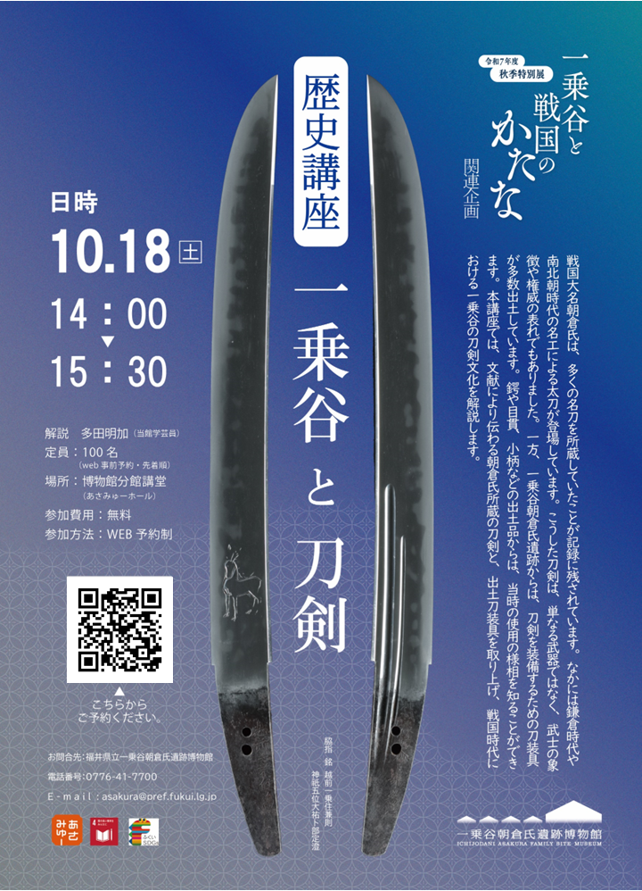 戦国大名朝倉氏は、多くの名刀を所蔵していたことが記録に残されており、なかには鎌倉時代や南北朝時代の名工による太刀が登場しています。こうした刀剣は、単なる武器ではなく、武士の象徴や権威の表れでもありました。一方、一乗谷朝倉氏遺跡からは、刀剣を装備するための刀装具が多数出土しています。鍔や目貫、小柄などの出土品からは、当時の使用の様相を知ることができます。本講座では、文献により伝わる朝倉氏所蔵の刀剣と、出土刀装具を取り上げ、戦国時代における一乗谷の刀剣文化を解説します。