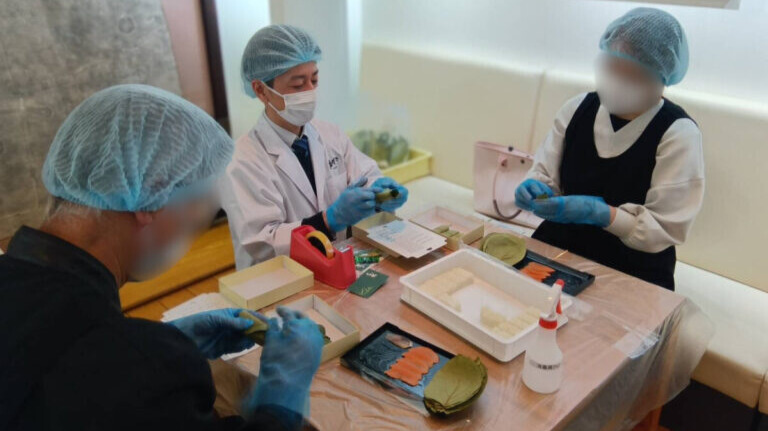 シャリを成型し、ネタを載せて柿の葉で包むところまで体験していただきます。「さば」「さけ」の計10個をお作りいただきます。作った柿の葉寿司はお土産にお持ち帰りください!