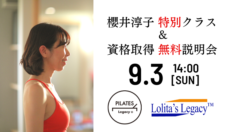 また、当日は、櫻井によるピラティス指導者養成コースLolita’s Legacy™️(ロリータズレガシー)の無料説明会も開催いたします。会場でご参加いただく他、オンラインでもご参加いただけます。