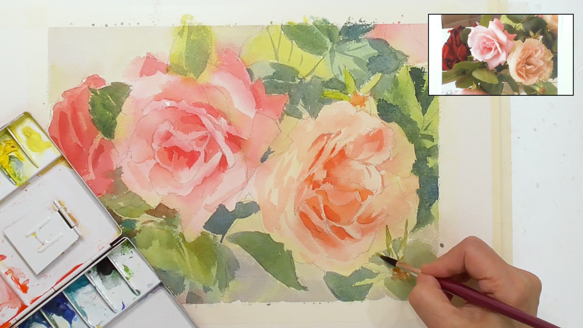 花を引き立てるため、緑の葉の存在をしっかり描きます。