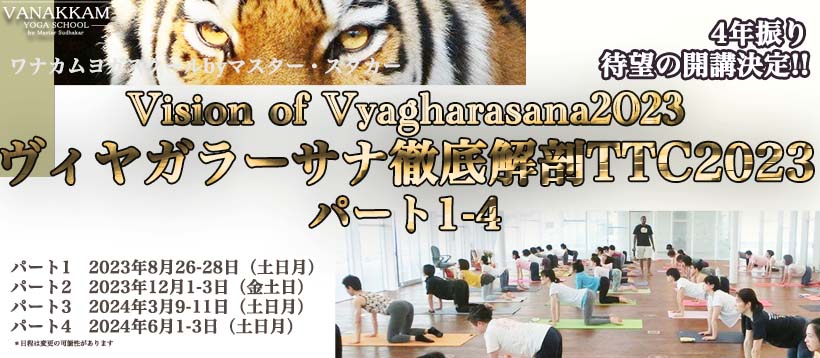 日本各地で“2時間のヨガクラスでここまでヨガの効能を感じたのは初めて!”という悲鳴が続出しているマスター・スダカーのヨガクラス。 そのマスター・スダカーのフローで必ずと言っていいほど登場するヴィヤガラーサナ・虎のアサナ。日本でキャット&カウとして軽んじられてきたこの一見単純なアサナから展開、発展していくヴィヤガラーサナフローを体験することにより、全ての上級アサナの基本は、ヴィヤガラーサナを日々地道に、そして正しく練習するという一点にあるのだということに、12日間のTTCを終えて、実感していただけます。