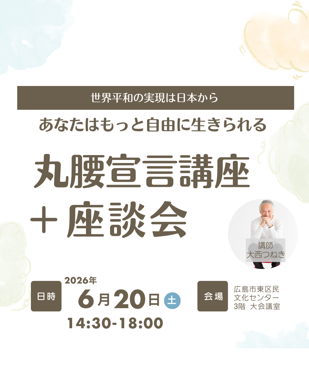 「丸腰宣言講座」では、丸腰という思想について伝え、生きることや死ぬことの本質を問う話をします。それによって、日本人が世界平和を作るという大きな使命を担うのか、否か。参加者全員で自分ごととして考えていただく会にしたいと思います。