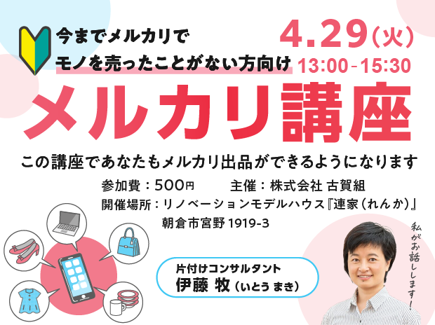 ・メルカリ講座当日は、出品予定の品を3点ほどお持ちください。