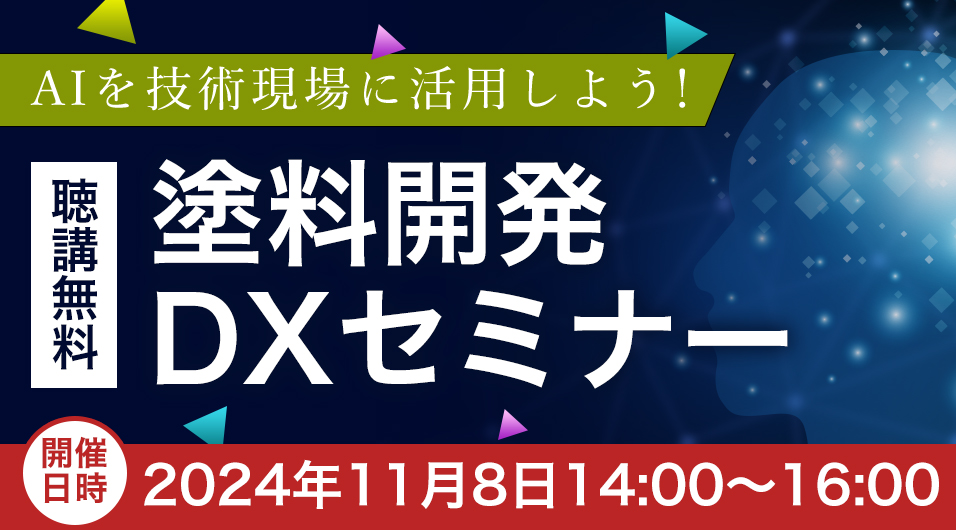 塗料報知新聞社は11月8日(金)、14時からオンラインセミナー「塗料開発DXセミナー」を開催します。化学産業ではマテリアル・インフォマティクスをはじめとした新しいソリューションが浸透しつつあり、DXやAI技術を活用した化学品の開発が進み始めています。