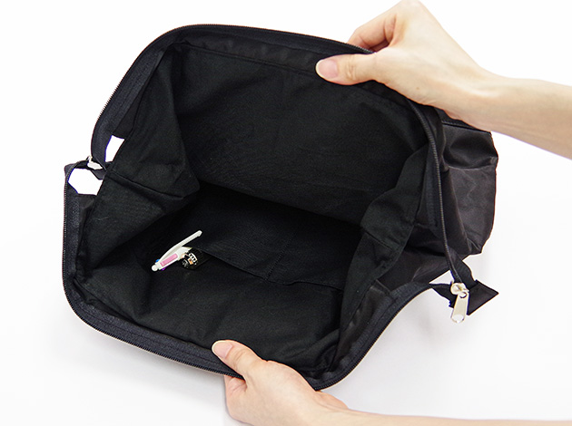 口が大きく開くので荷物の取り出しがしやすく、フロントポケットや内ポケット付きで使いやすいリュックです。