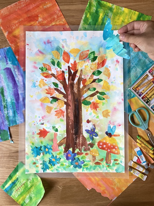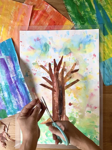 ・秋色素材を好きな形に切る、組み合わせて貼る(貼り絵)