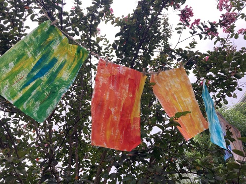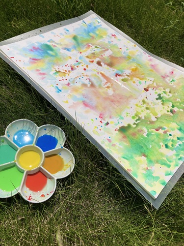 ・絵の具で大きな紙に色を垂らす(ドリッピングアート)