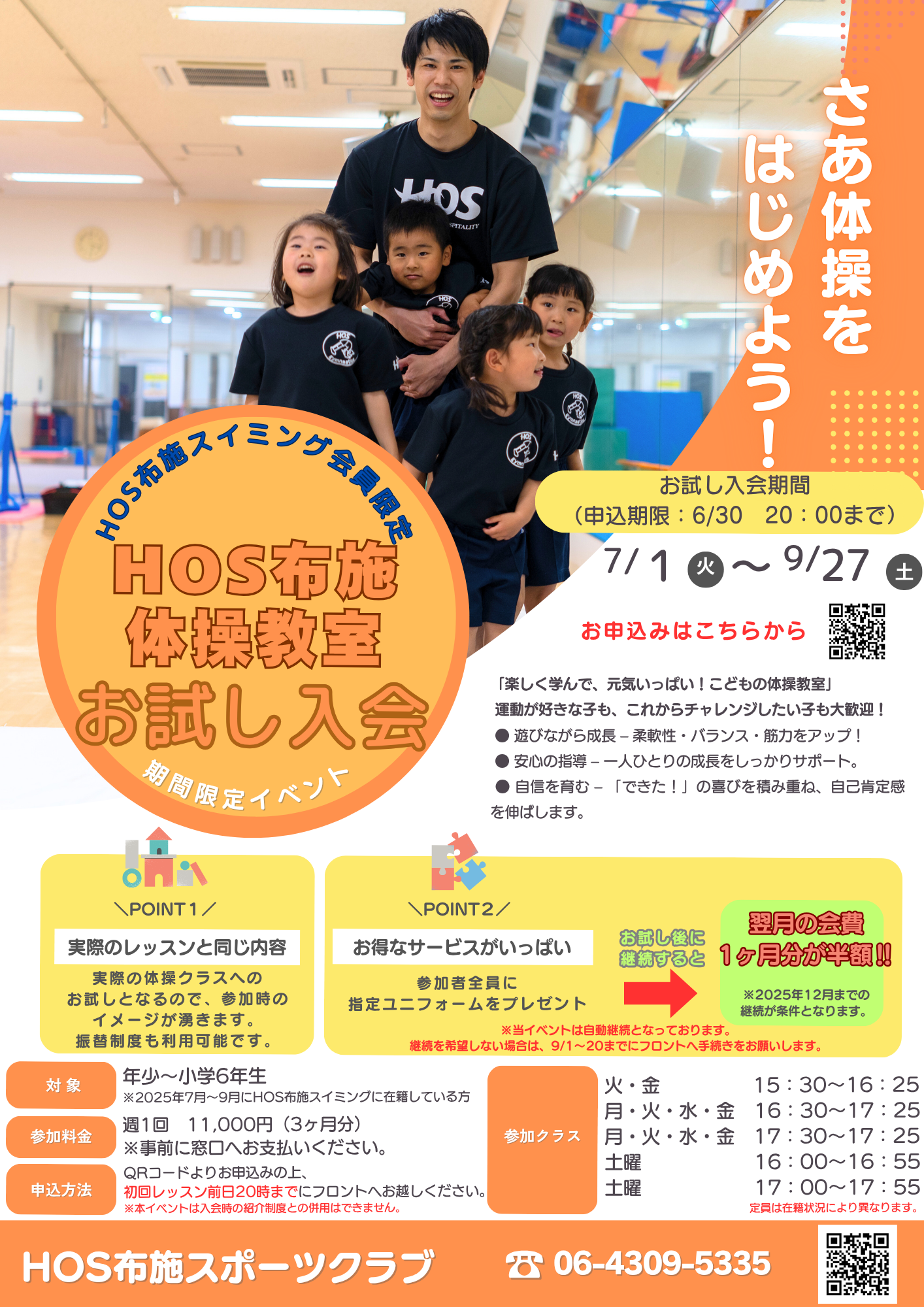体操教室に3ヶ月間11,000円(税込)でお試し入会いただけます。ユニフォーム上下のプレゼントもございます。