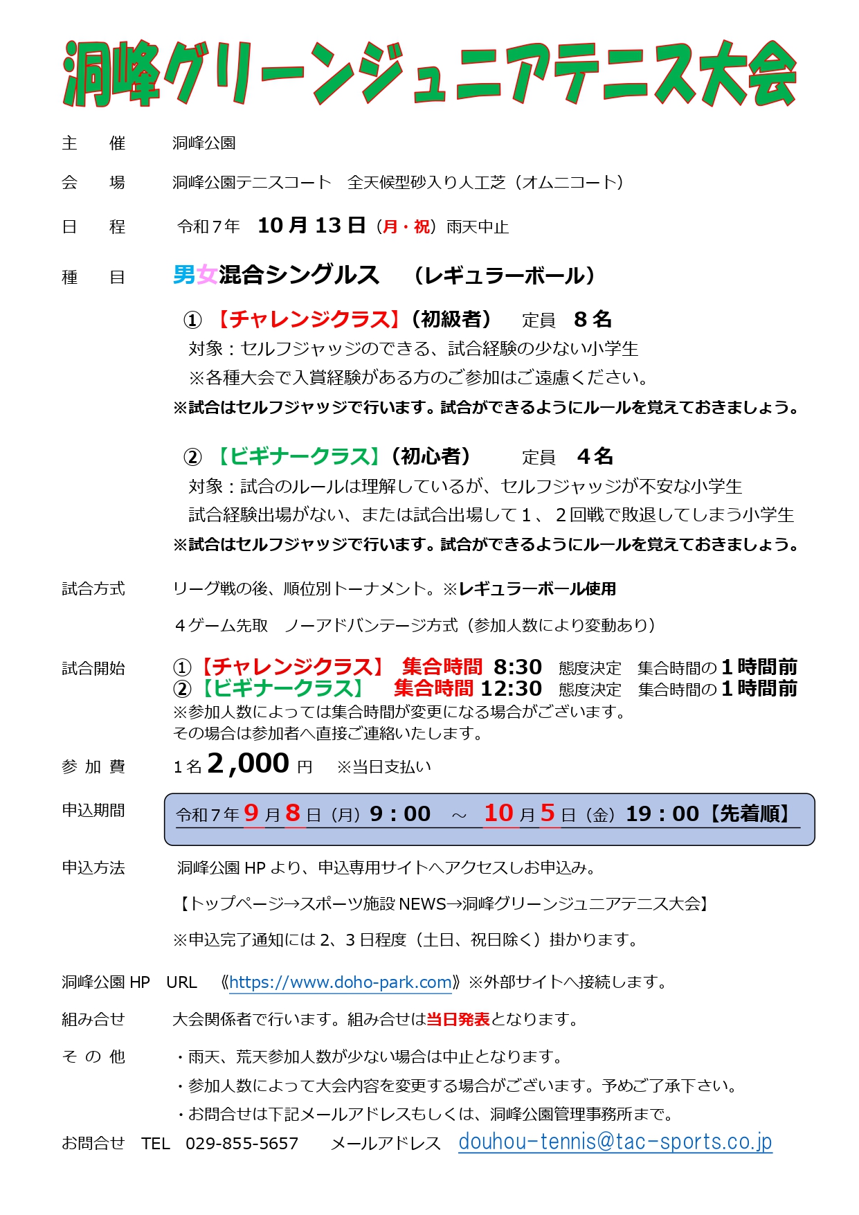 ご不明な点等ございましたら、douhou-tennis@tac-sports.co.jp もしくは 029-855-5657 洞峰グリーンジュニアテニス大会 担当:村松までご連絡くださいませ。申し込みは終了しました