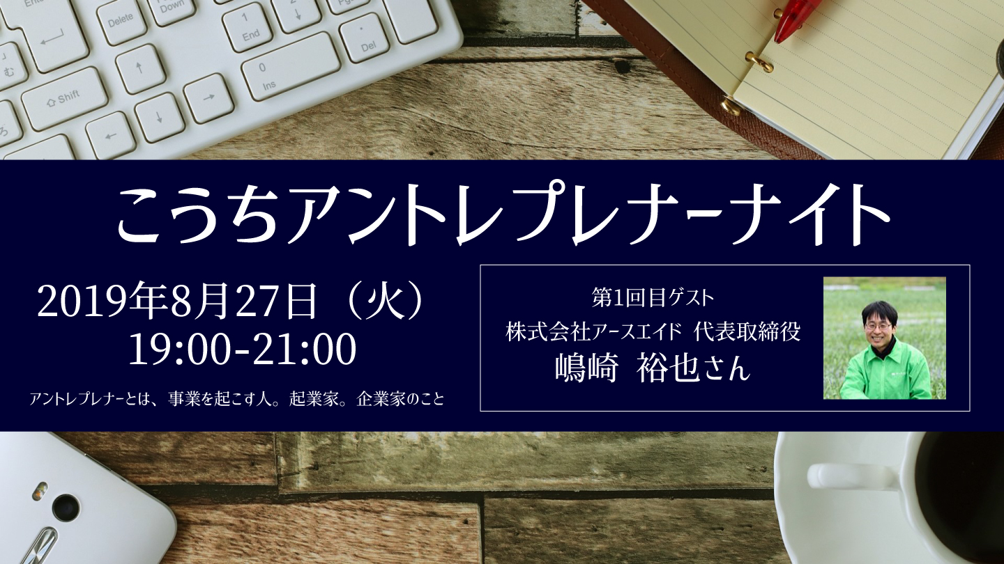 こうちアントレプレナーナイト、第1回目となるセミナーでは、株式会社アースエイドの代表取締役・嶋崎裕也さんをゲスト講師にお迎えします。