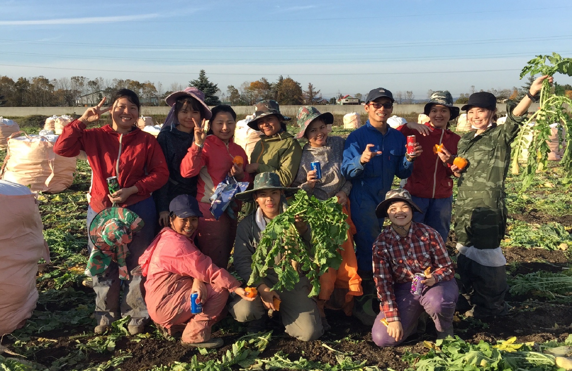在留外国人も多い地域である為、移住者や外国人がスタッフとして一緒に働いており、年齢も20代から70代まで多様です。畑作物である「じゃがいも、小麦、大豆、そば」の大規模栽培からマイナー作物の「黒千石、いなきび」園芸作物の「アスパラガス、スイートコーン」の生産・販売を行っています。