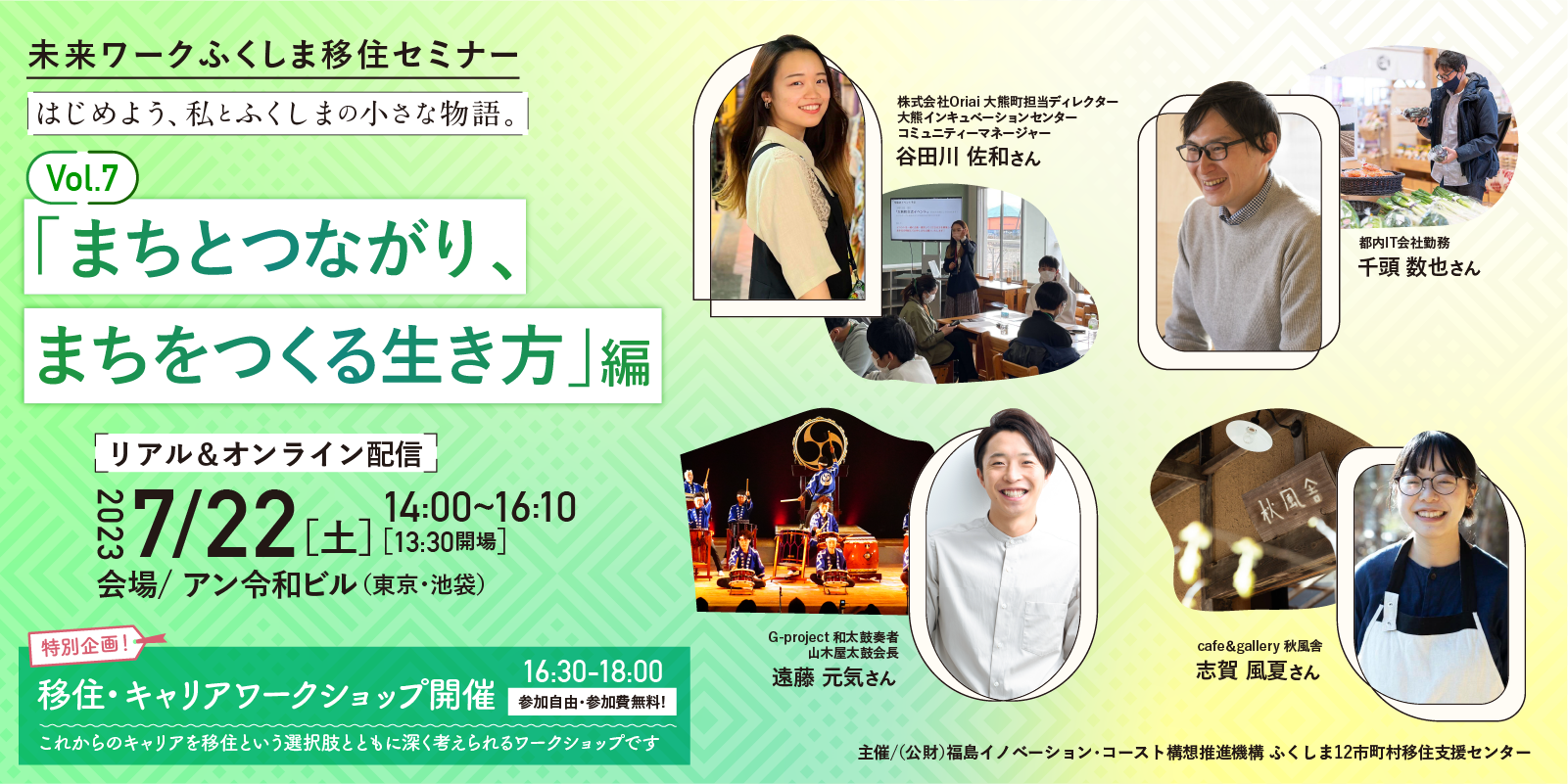 特別企画として、同会場にてセミナー終了後に移住・キャリアワークショップを開催します (16:30-18:00) 。ご自身のこれからのキャリアやその選択肢としての移住に関して、ゲストや移住担当スタッフ、そして移住を検討している仲間たちと一緒に、深く考えられるワークショップです。セミナーで感じた疑問や悩みをそのままにせず、その日のうちにワークショップを通じて、言語化し、移住に向けた次のアクションプランまで一緒に考えてみませんか?みなさんの抱えている不安や疑問が少しでも払拭できるよう、全力でサポートいたします!ワークショップの内容を踏まえた、移住担当スタッフとの個別相談や、会場内で福島12市町村のイベントやツアーの申込受付も可能です。