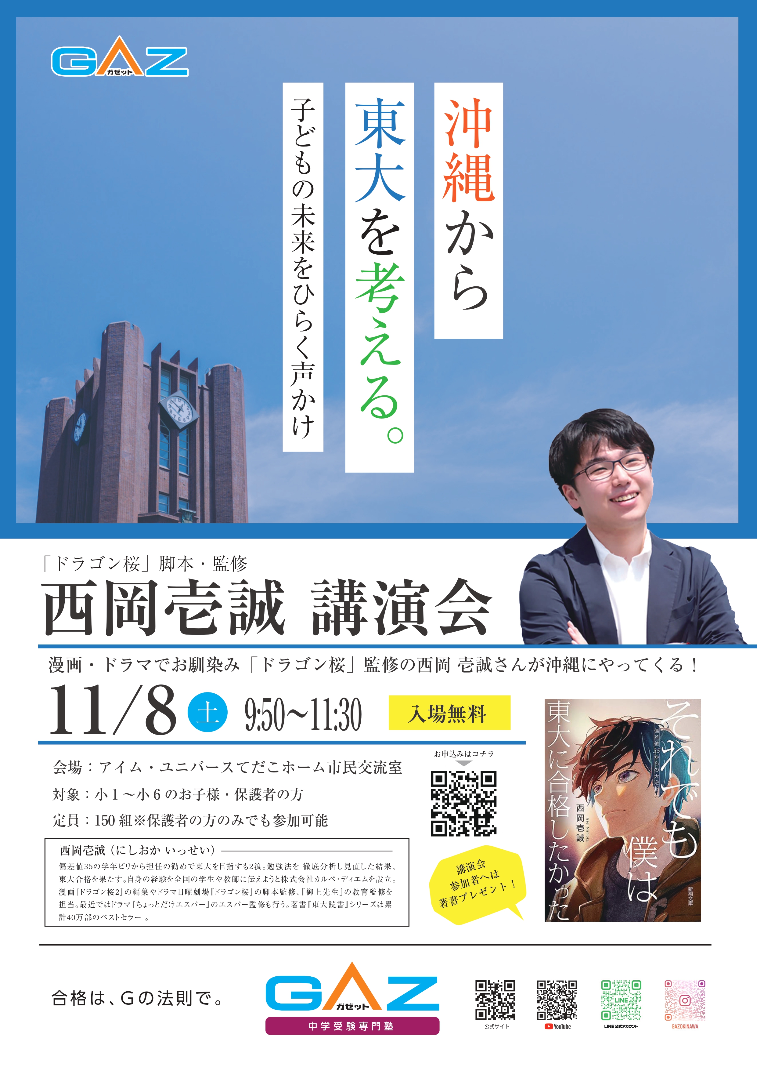 漫画・ドラマでお馴染み「ドラゴン桜」のモデル西岡 壱成さんが沖縄にやってくる!お子様のやる気を引き出す声かけやご家庭での関わり方、中学受験の意義などをお話しいただきます。