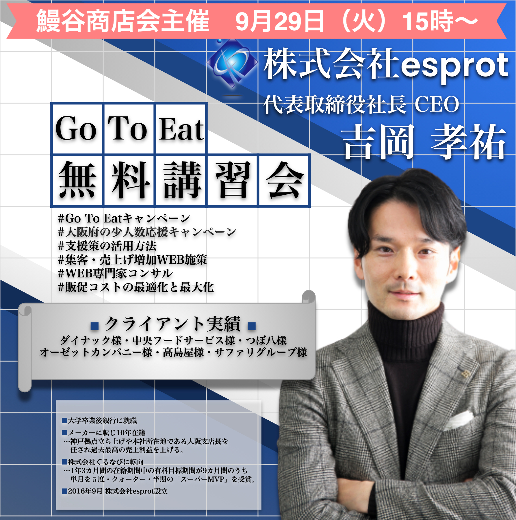 GoToEat、GoToトラベル、大阪府市少人数応援キャンペーンについて、鰻谷商店会に多くの問い合わせやご相談がございます。当会としましても、大阪ミナミの活性につながるように支援をできれば思い、この度無料講習会を開催することにいたしました。