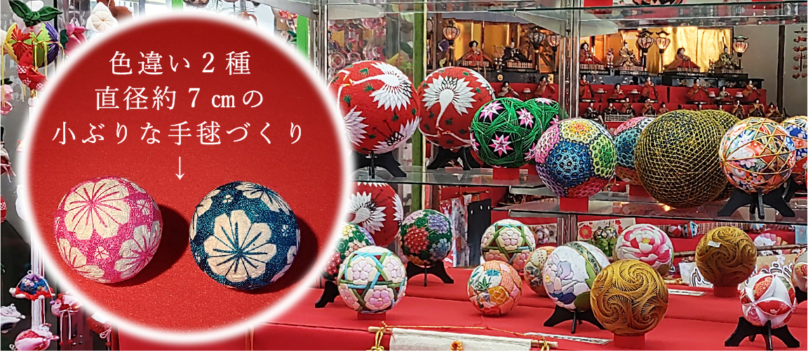 昨年も好評だった、柳川まりをつくる体験です。桃・青・赤・黄・黄緑・橙の6色の中から好きなカラーを2色お選びいただけます。1つは講座内で、もう一つはご自宅での制作となります。