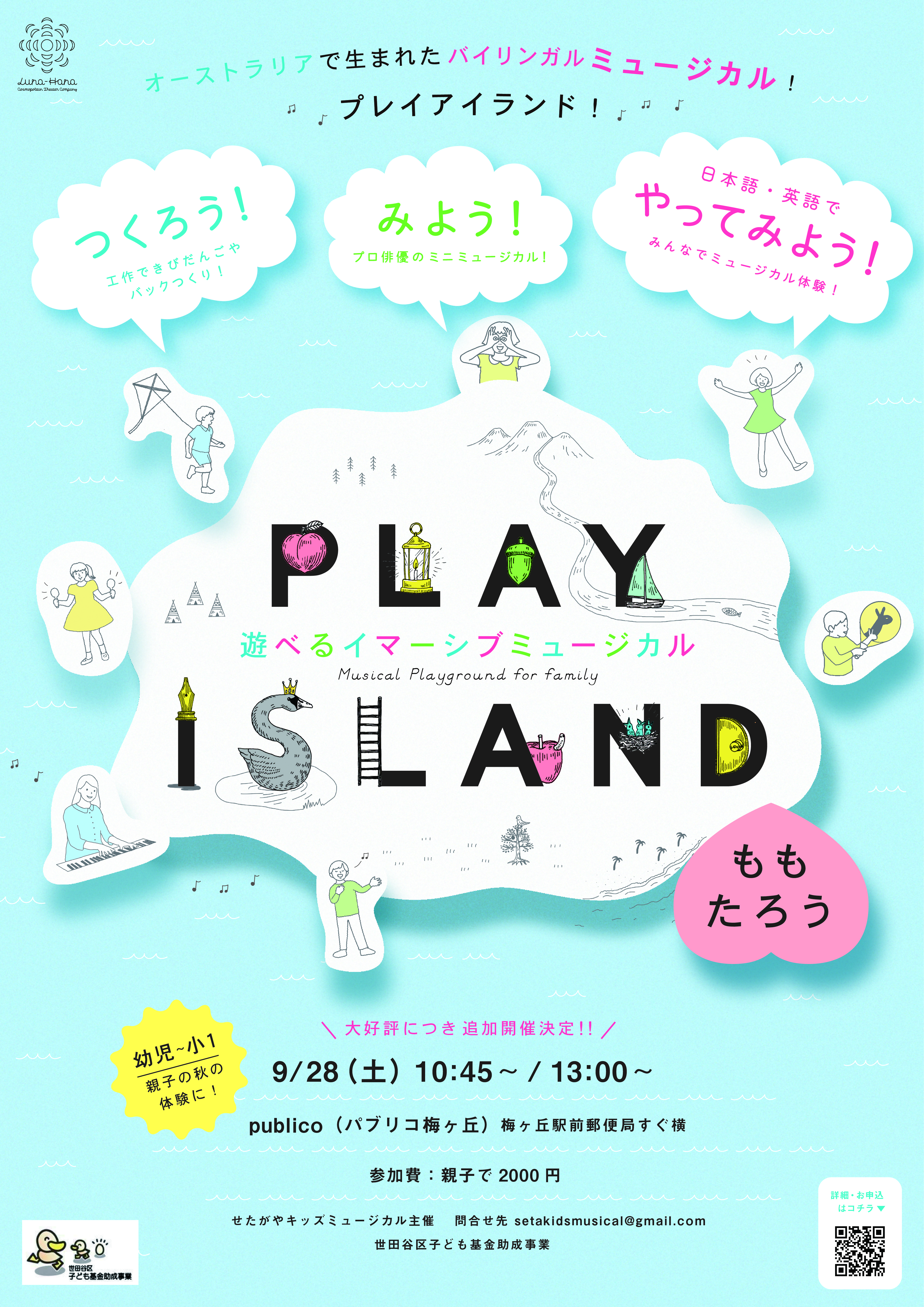 アメリカ・オーストラリア・東京でのミュージカルやイマーシブシアター創作経験やオーストラリアと東京での子育てから、幼児親子が一緒にミュージカルで遊べる機会を作りたい!と始めた本企画。作った工作を使ってごっこ遊び!親子で一緒に楽しめる観劇体験に!ミュージカルを通じて、親子で“一緒に遊べる”体験が、親子のかけがえのない共創体験になったら嬉しいです。「桃太郎」は、オーストラリアで幼児期の子供達の異言語や見た目の違う人への反応をみながら、“異”とポジティブな出会いを作りたいと選びました。オーストラリアの親子たちは異国の昔話に大盛り上がりでした!日本のお話を始まりに、アイランド=島の文化や言語を反映する様々な物語を使って、親子で遊べるイマーシブミュージカル体験を創っていきます。是非ミュージカルで一緒に遊びましょう♪