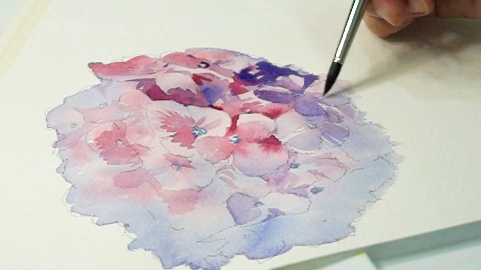色のグラデーションが特徴のアジサイは、水彩らしい表現を習得するのに特に勉強になります。滲ませた色をどう活用するか、描きながら学んでいきましょう。