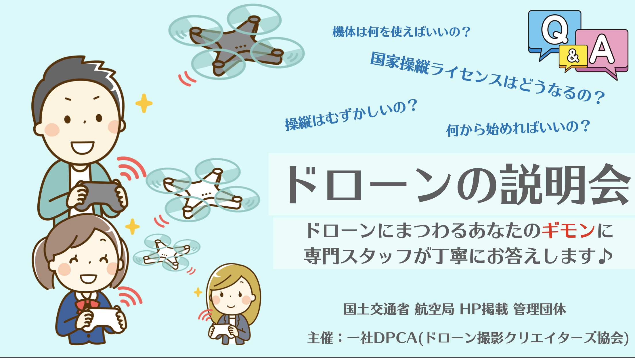 この説明会では、ドローン講習会に関することや、2022年12月からスタートする国家操縦ライセンス制度のことなどあなたのドローンにまつわる "ギモン" に専門スタッフが丁寧にお答えします!