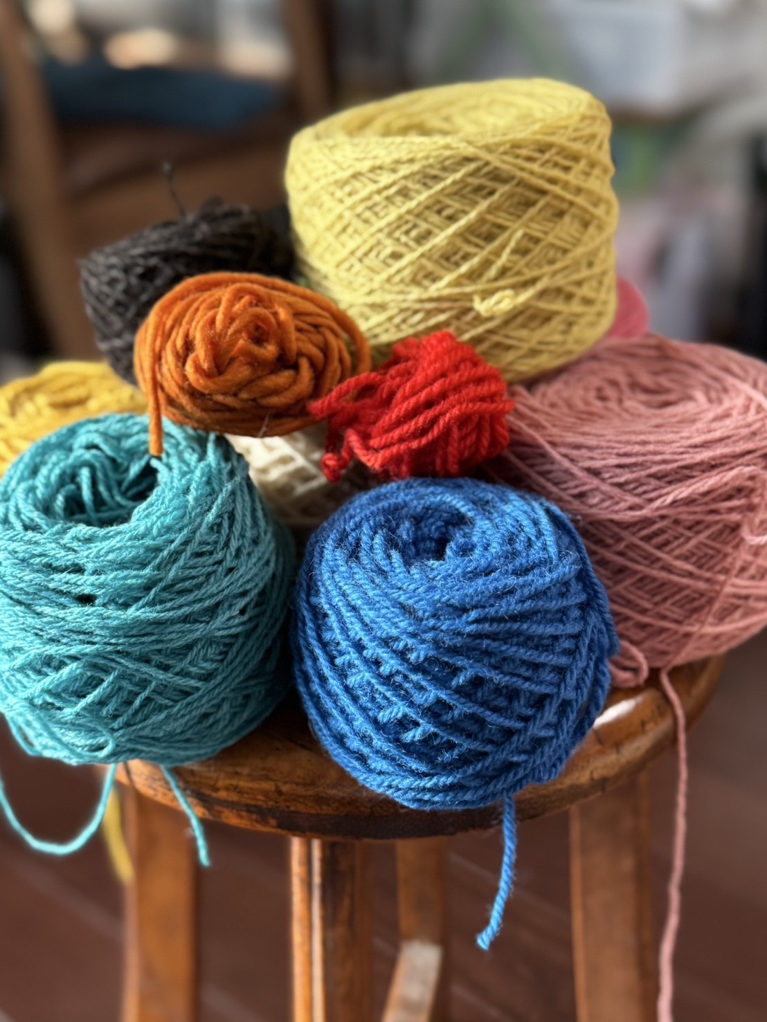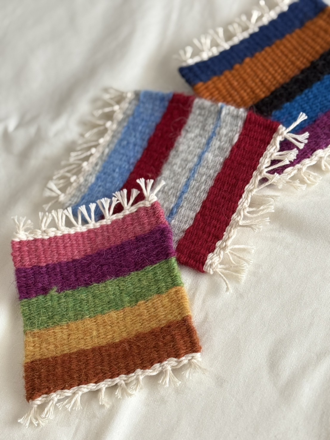 ウールの糸をたくさん用意しますので、その中からお好きな色を3〜5色選んで織っていただきます。