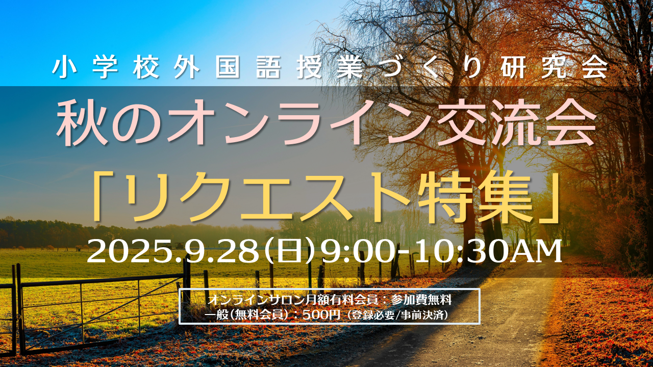 今回の交流会はリクエスト特集!小学校外国語(英語)に関することで、お聞きになりたいこと、話し合いたいことを事前にリクエストを募集します。「**のテーマのよいActivityを教えてほしい」「**の指導はどうしたらよいか」「こういうタイプの児童にはどう接したらよいか」「活動を行うときに***ことに困っているがどうしたらよいか」「校内や地域で研修をしたいが、どんなことをしたらよいか」などなど、普段、なかなか相談できず困っていることを、ちょっとしたことも含めて、なるべく具体的に教えてください。その話題について、皆さんと一緒に考えていきます。