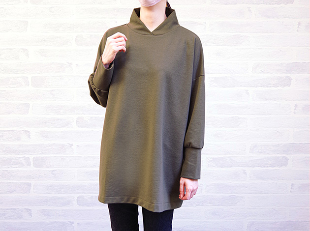NHK すてきにハンドメイドにも出演されている洋服作家の伊藤みちよさんに、ベビーロックの2本針4本糸ロックミシン「Sakura」を使って、前えりの端が少し重なるスタンドカラーがポイントのチュニックを作っていただきました。