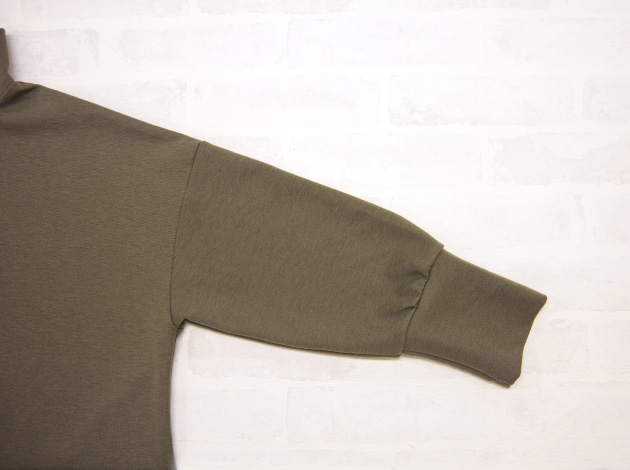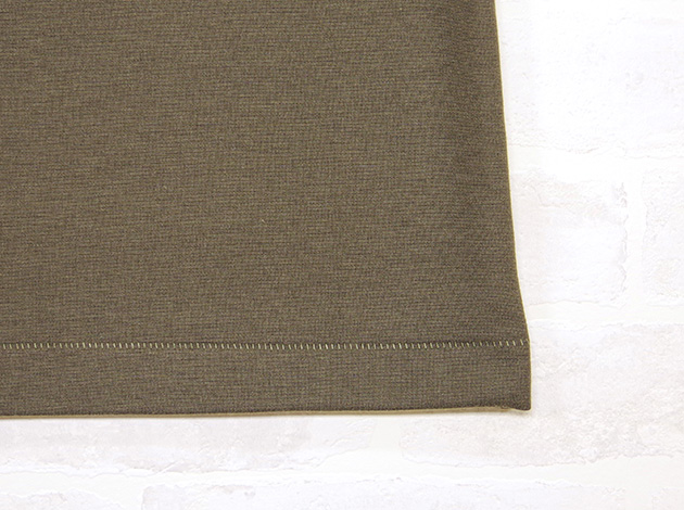 今回の生地は、光沢のある着心地のいいポンチニットを使用しています。おしゃれで落ち着いた色味が魅力のカーキ色を採用しました。