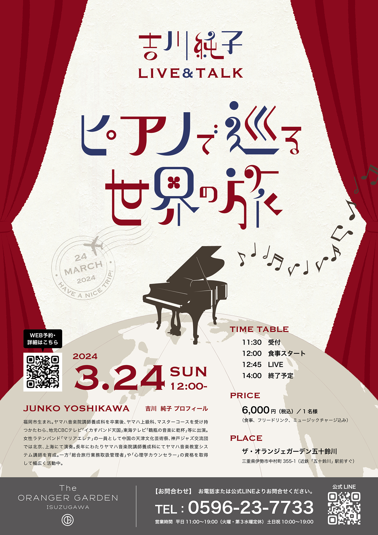ザ・オランジェガーデン五十鈴川のシェフが手がけるランチを味わいながら、ピアノの音色を堪能する、楽しいお時間をお過ごしください。