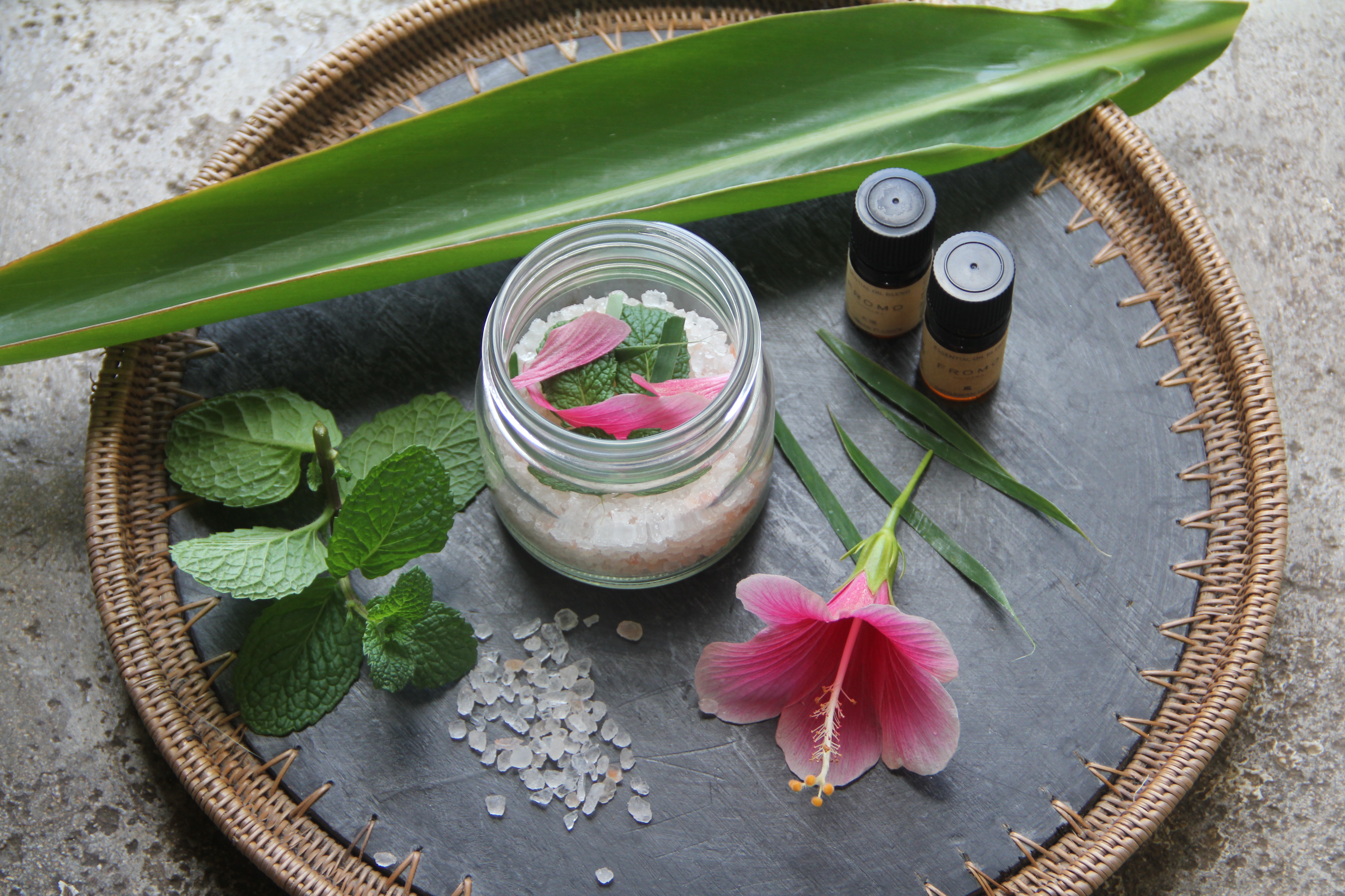 季節のハーブ(ミント、月桃、ハイビスカスなど)でオリジナルのバスソルトを作ります。