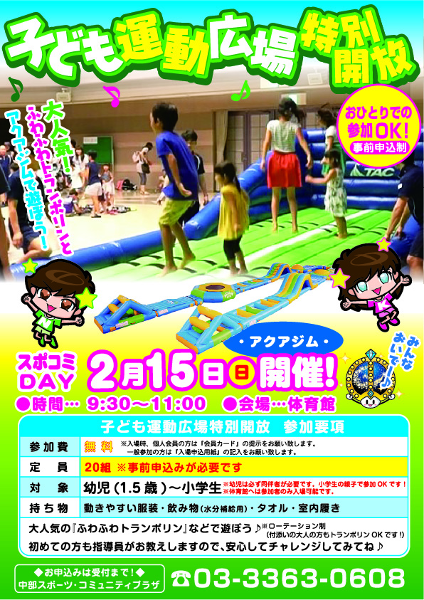 持物:動きやすい服装、室内履き、飲み物、タオル
