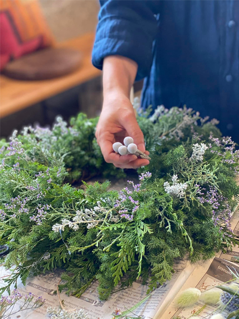 森の香り広がる木の実や針葉樹を束ねて、