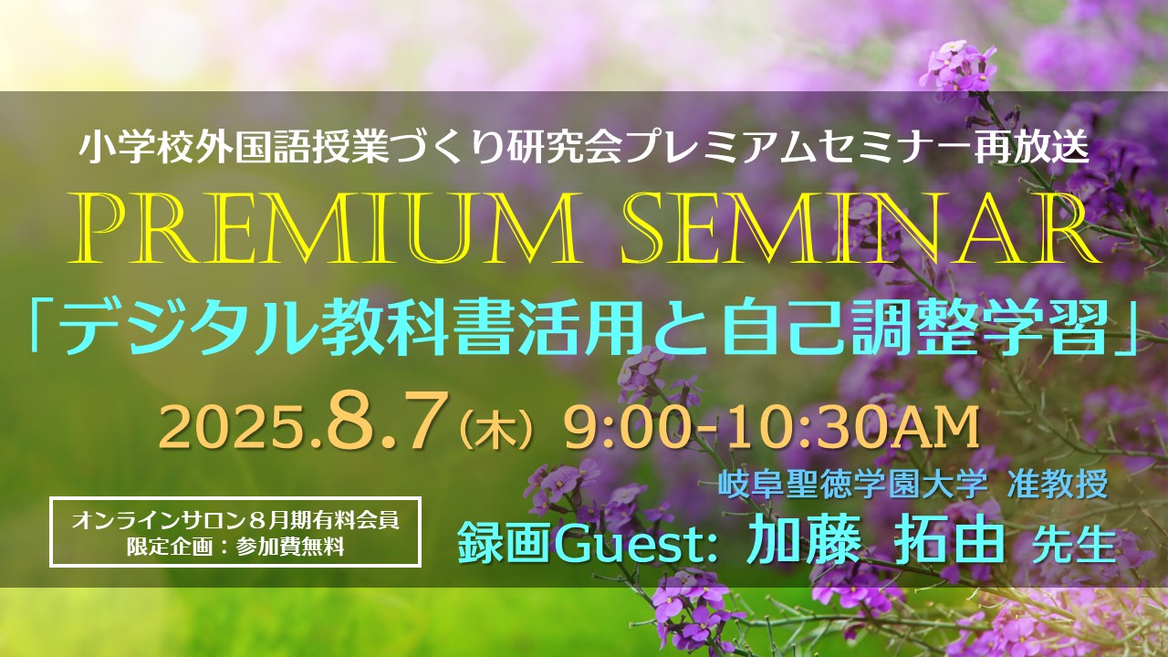 【再】小学校外国語授業づくり研究会プレミアムセミナー再放送「デジタル教科書活用と自己調整学習」(録画ゲスト:岐阜聖徳学園大学准教授 加藤拓由先生)