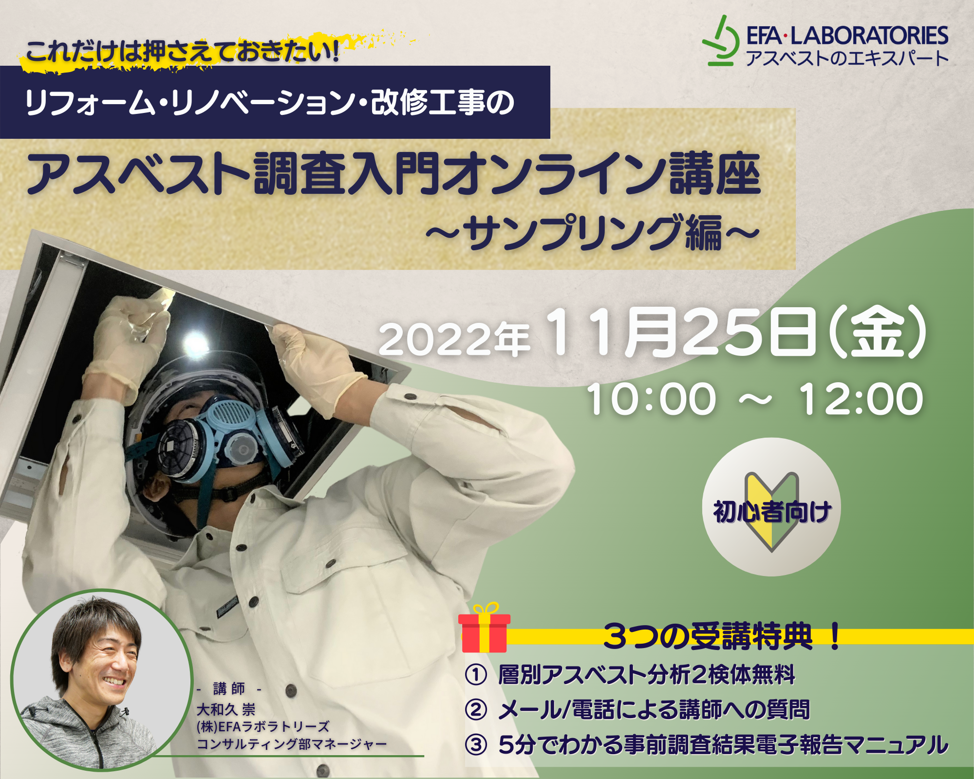 株式会社EFAラボラトリーズ(本社:東京都千代田区、代表取締役:亀元 宏宣)は、リフォームやリノベーション工事を施工される方を対象に「リフォーム・リノベーション・改修工事のアスベスト調査入門オンライン講座~サンプリング編~」を開催いたします。