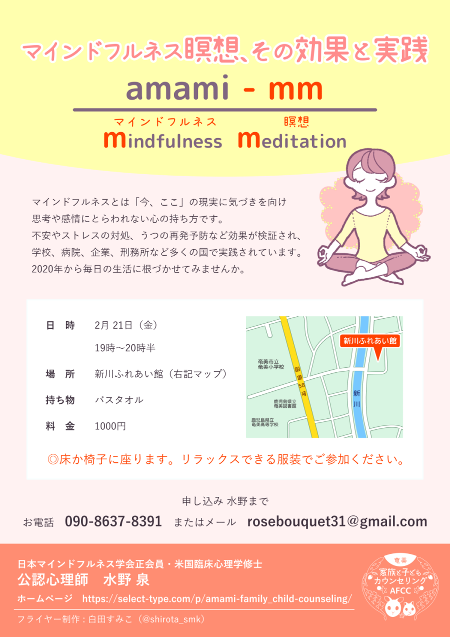 公認心理師。日本家族と子どもセラピスト学会、日本マインドフルネス学会、日本心理臨床学会正会員。