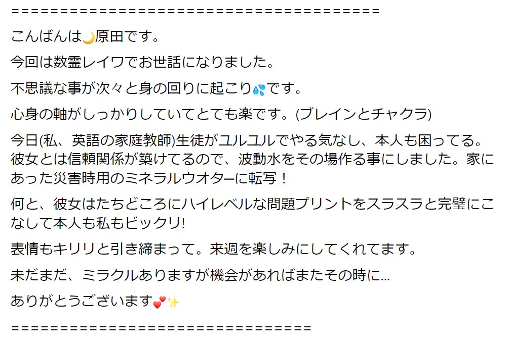 それを確かめる為にこれまで私のセミナーに参加してくれた方やお客様はじめ、約200人の方に山之内先生が開発された波動調整装置(数霊REIWA)を試して貰ったところ、当初の予想を遥かに超える驚くような結果が続出しました。