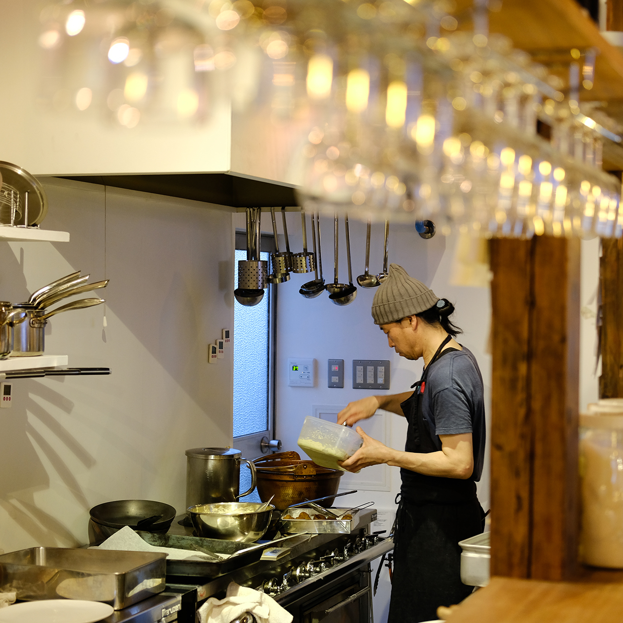 釣りがきっかけで少年時代から山や自然と親しんできた薄井シェフは、レイチェル・カーソン『沈黙の春』との出会いから「釣り」と「環境」の関係を意識し、大学生時代は「環境」について研究したそうです。卒業後、レストランで働いたことで「環境」と「食」が結びつき、さらにスコット・ジュレクの『EAT&RUN 100マイルを走る僕の旅』を読んだことでヴィーガンという生き方を選択し、2017年に黒磯にヴィーガンレストラン『HIKARI SHOKUDO』をオープンされました。