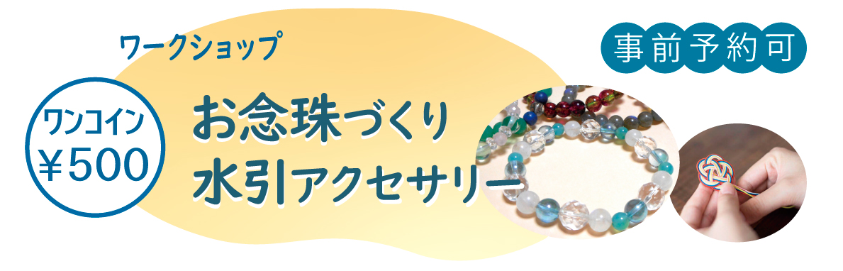 ワンコインワークショップ「お念珠づくり」と「水引アクセサリー」