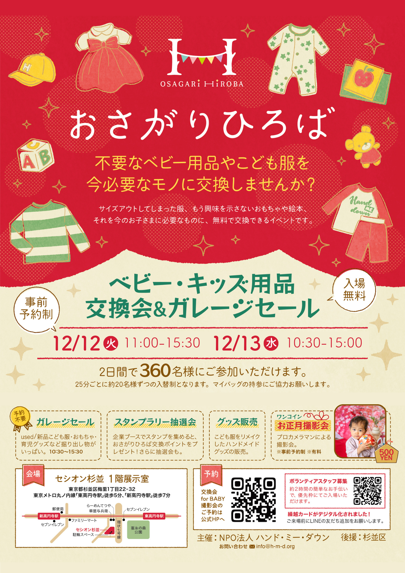 不要なベビー&キッズ用品を持ち寄り、今のお子さまに必要なモノに交換できるイベント「おさがりひろば」を企画・運営しています。