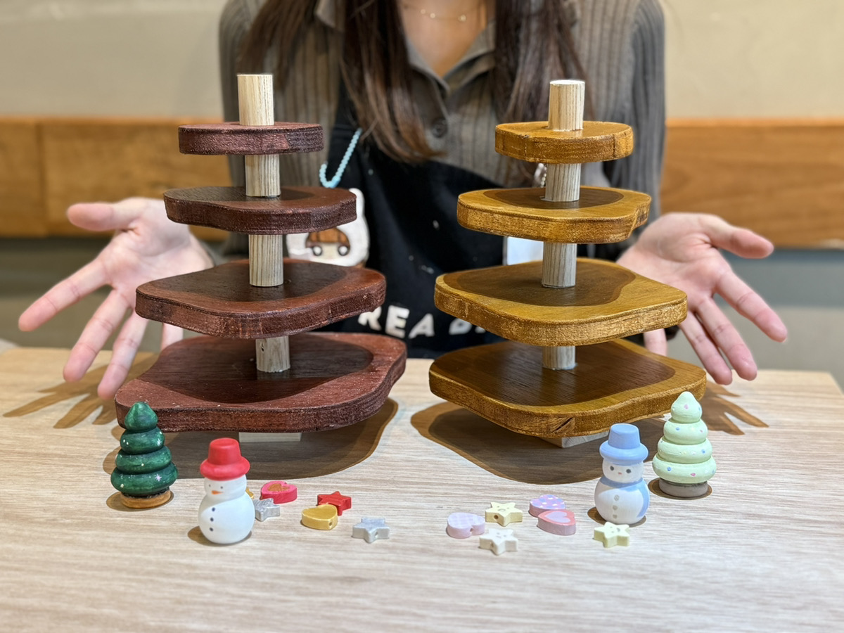 小さなオーナメントには絵の具で好きな色や模様を描き、自分だけの温かみのあるウッドツリーがつくれます。