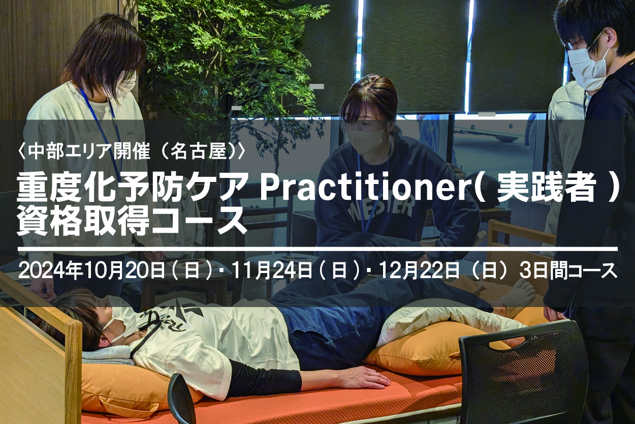 重度化予防ケアPractitioner(実践者)養成研修とは、医療・介護に携わる支援者の方が重度化の予防に必要な知識・技術等を修得し、それぞれの現場で重度化の予防を実践できるようになることを目的としています。3日間を通し、現場で起きている重度化の原因の理解と考え方、そして予防のための基本的な技術とケアマネジメント、実際の福祉用具を使用した実技などを通して重度化予防ケアを学んでいきます。養成研修の修了時には現場実践報告書を提出していただき、合格した方には重度化予防ケアPractitioner(実践者)の協会認定証とピンバッチを付与いたします。