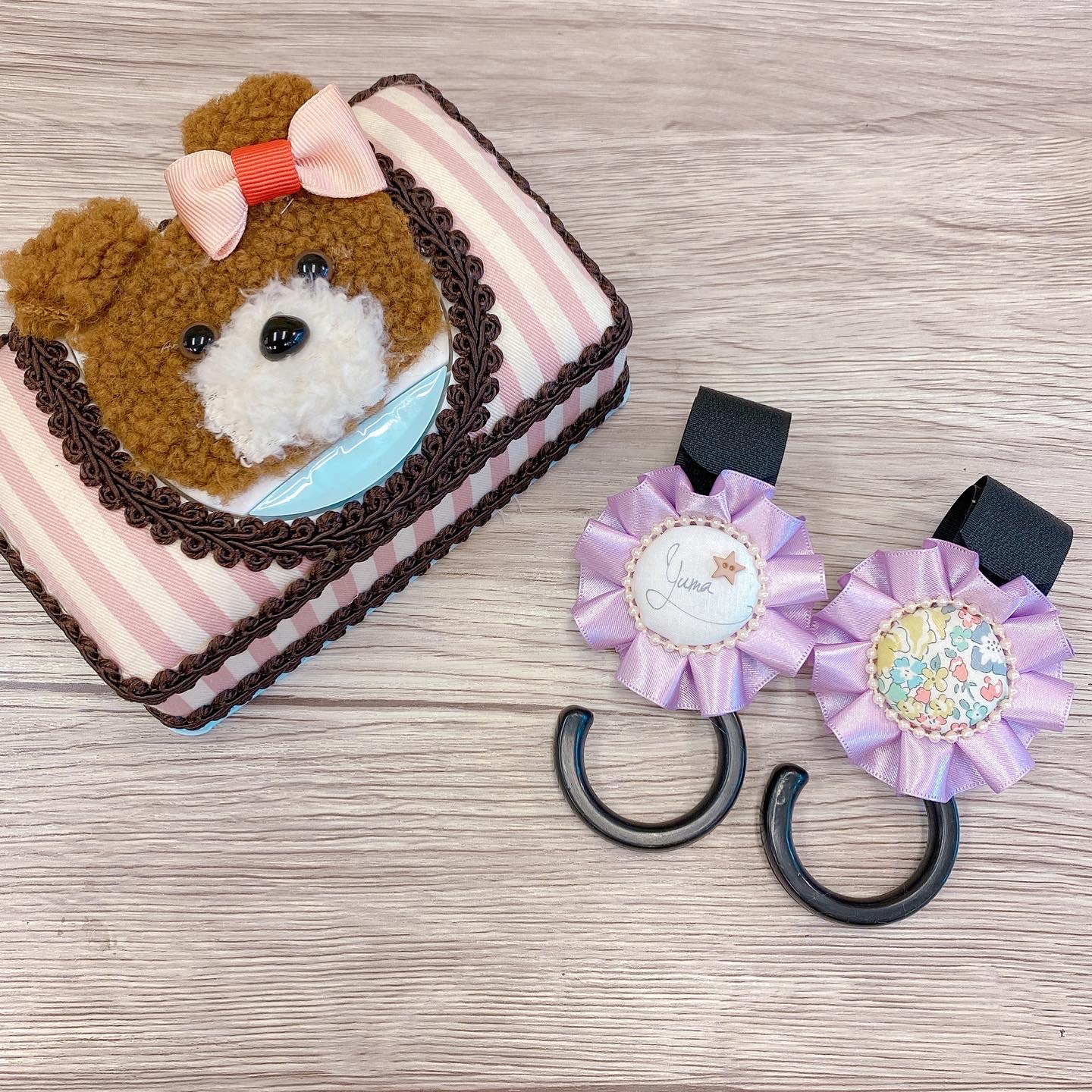 ベビーカーフック:ロゼットを応用して、オリジナルのベビーカーフックを作ります。